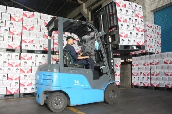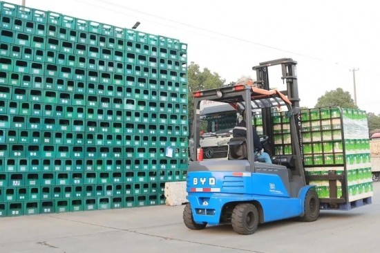 新能源叉車配置的磷酸鐵鋰電池,具有安全、環保的特性,且零排放、無污染,在保障生產環境安全作業的同時,為廠區原材料食品安全筑起防護墻,嚴格杜絕了原材料在搬運過程中遭受二次污染的可能。同時比亞迪鋰電池叉車性能可靠、動力強勁、隨充隨用、壽命長,可充分滿足啤酒企業高負荷運轉需求。
