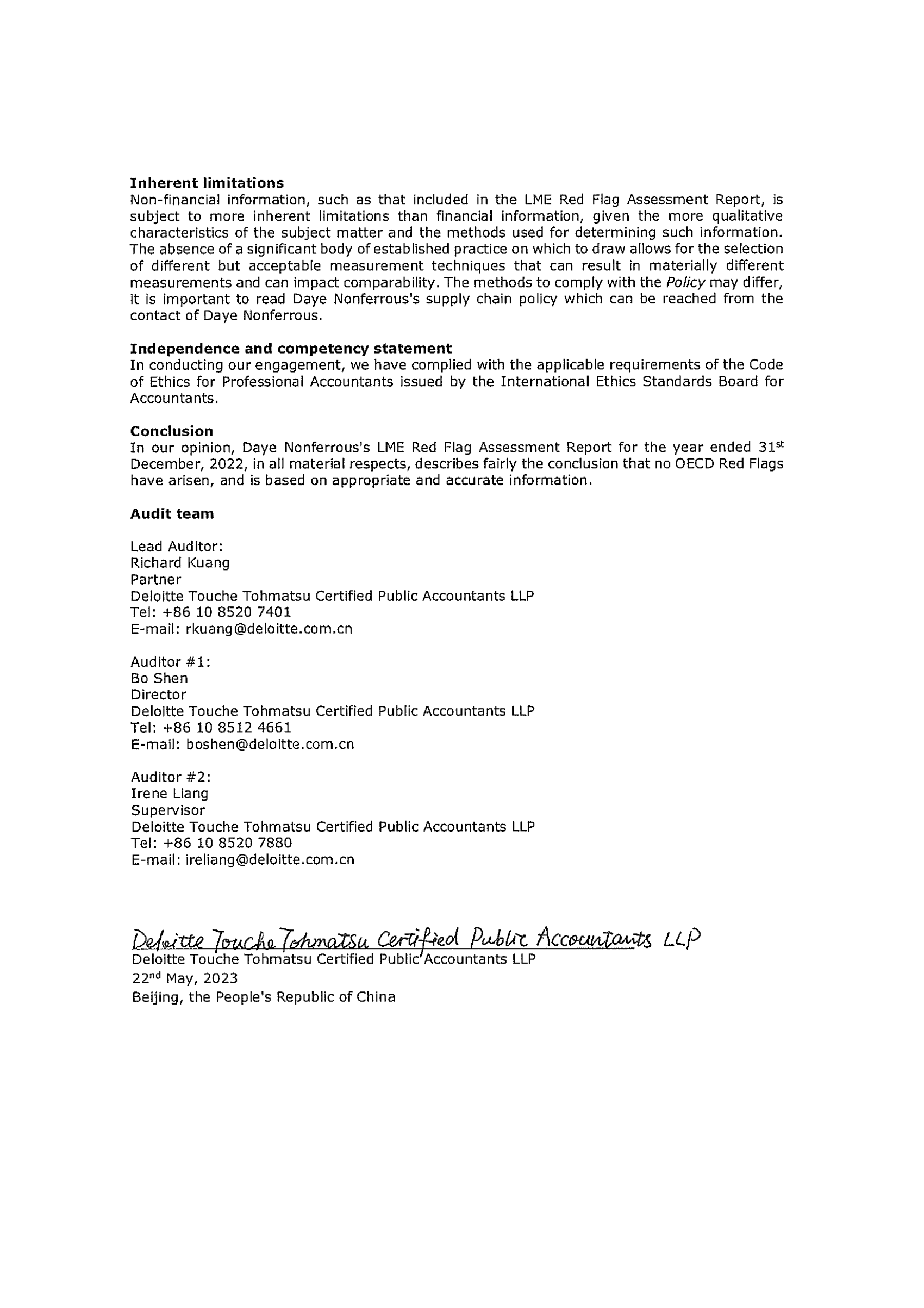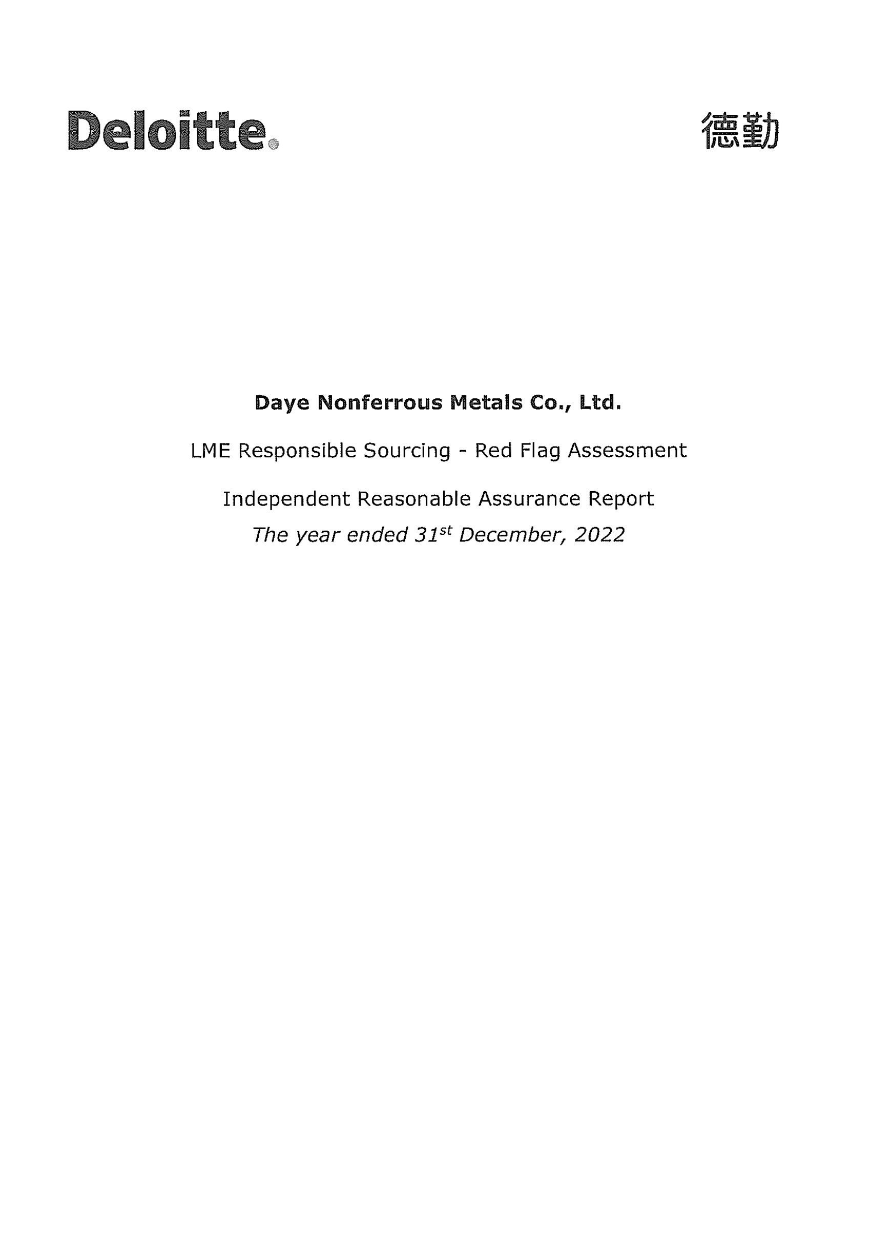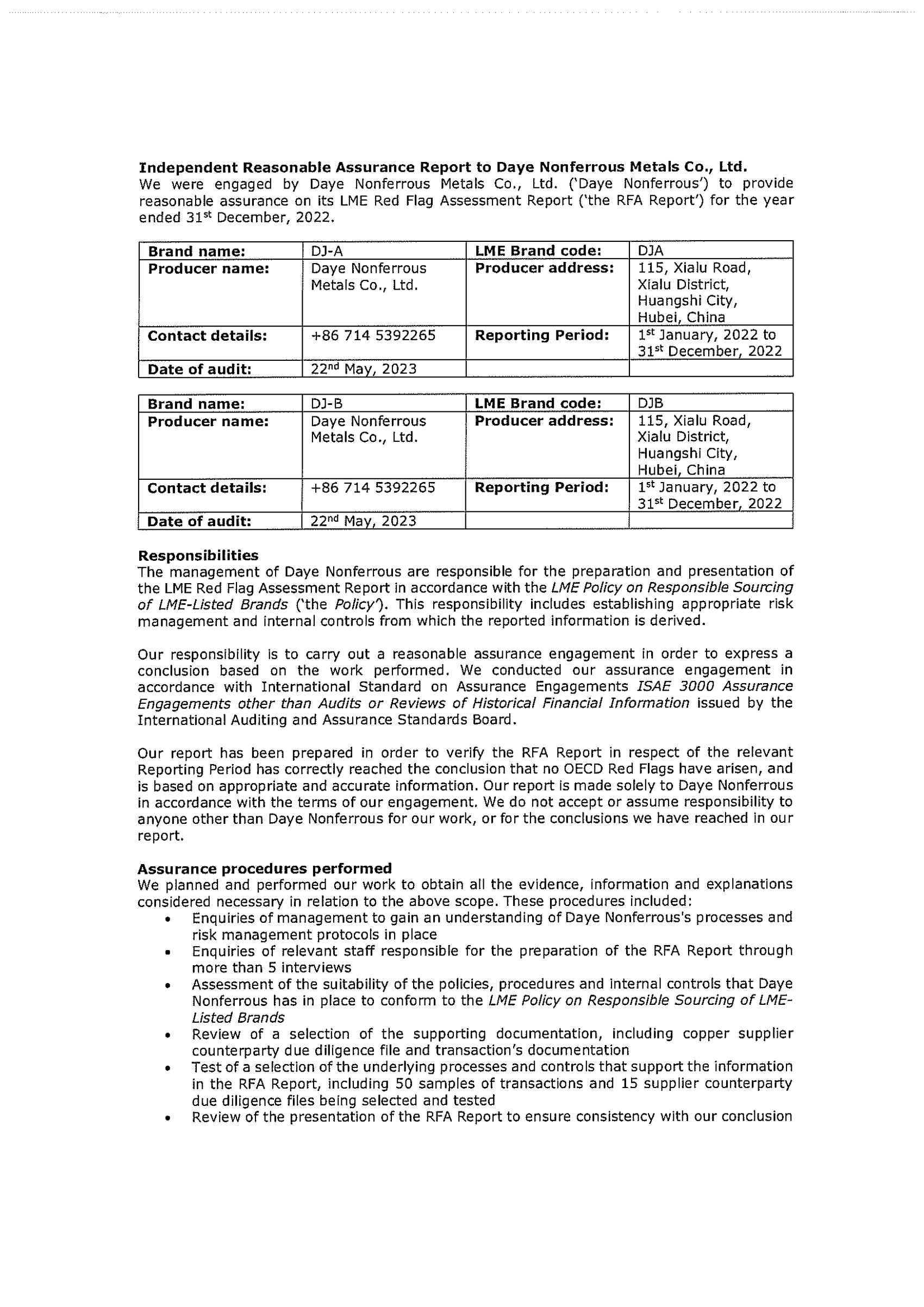 LME Responsible Sourcing - Red Flag Assessment IndependentReasonable Assurance Report_Daye Nonferrous 2022